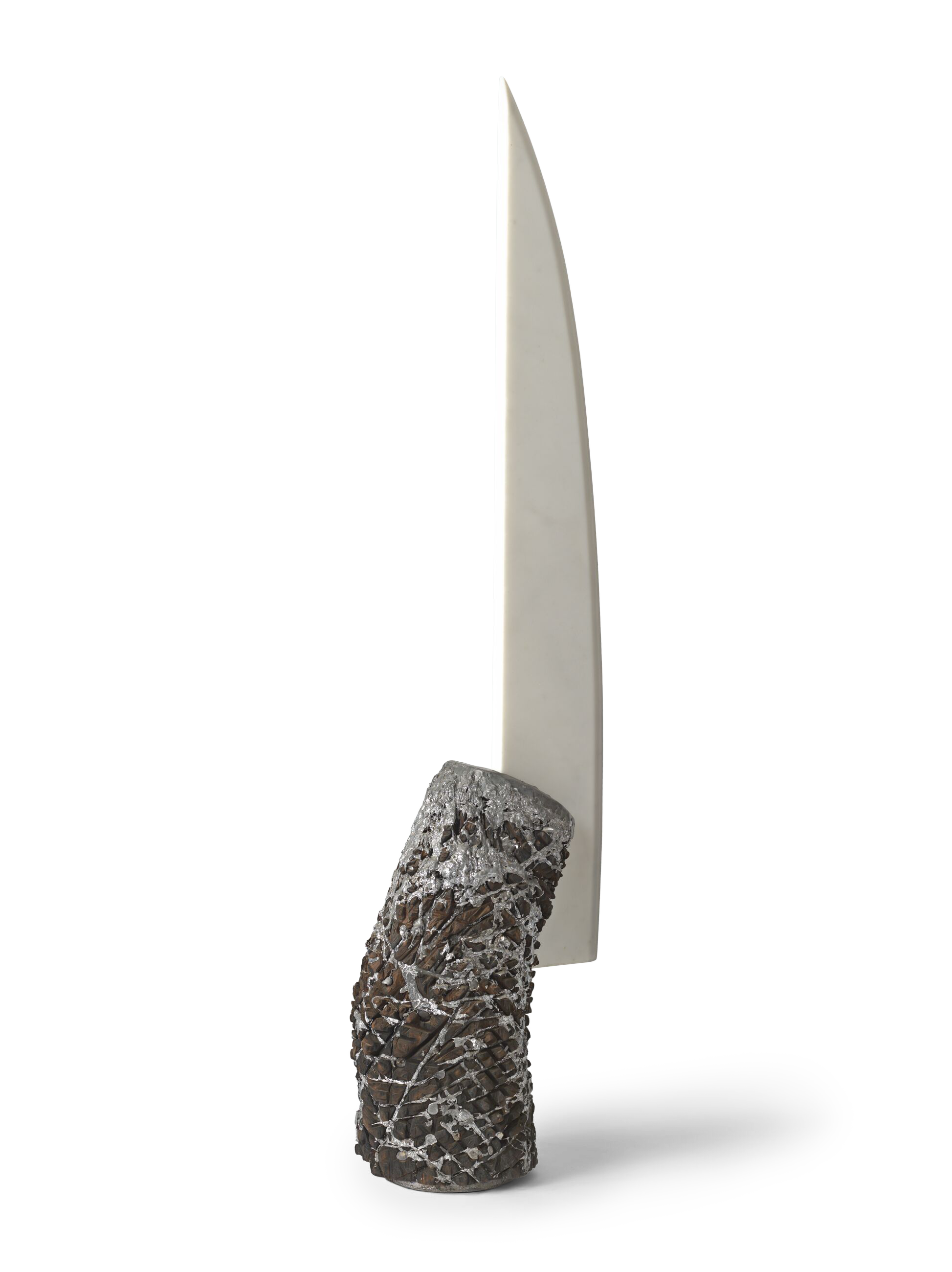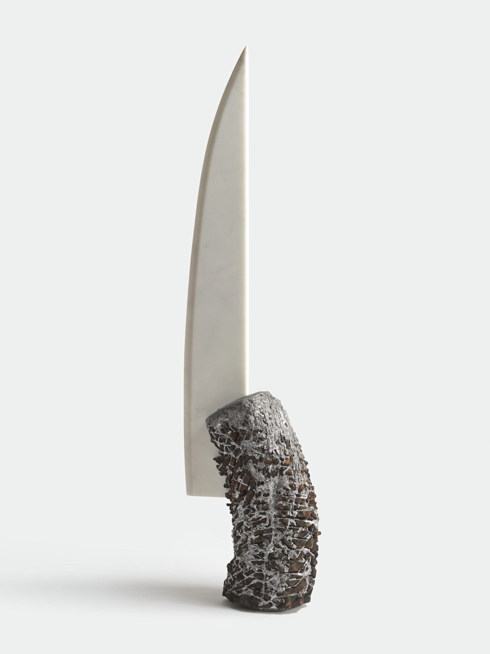 ‘The Apollonian Sword’ (2014) fuses forms ancient and modern, European and African, poetically enacting a full circle of Whitten’s artistic engagement that was posthumously celebrated in the first museum survey of his sculpture practice. As with ‘The Apollonian Sword’, most of Whitten’s sculpture produced after 1969 was created in the Cretan village of Agia Galini, Greece, where the artist summered with his family every year and worked out of his open studio. Whitten’s ‘The Apollonian Sword’ summons a communal aspect in its balanced accumulation of sourced materials and is one of five closely related sculptures that each incorporate a marble blade as a central element, invoking ancient knives and swords. Upright and gleaming, ‘The Apollonian Sword’ majestically embodies the strength and harmony of Apollo, the Greek god of light.